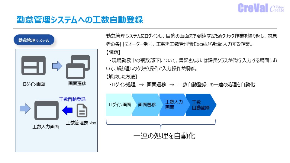 こちらの会社にご相談させていただいたところ、このExcelをそのまま流用し、ウェブシステムに工数を自動入力する機能を付加できるとのことでした。Excelからウェブシステムを自動操作できるとは想像もしていなかったので半信半疑でしたが、実際に自動的に工数が入力されていく様子を見て感動いたしました。結果、毎週月曜日の午前中に本来業務に専念することができるようになりました。