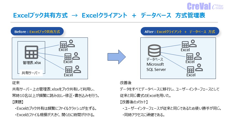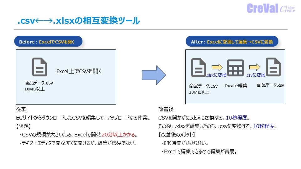 このような悩みをご相談したところ、CSVデータを転記する機能をこのExcelに持たせて頂くことができました。取り込む元となるCSVは様々な書式を持っていましたが、それらすべての書式に合わせて取り込めるように工夫いただきました。何か別のソフトを必要とするわけではなく、Excelに備わっているVBAというもので自動化を実現できることが目からうろこ状態でした。餅は餅屋、Excelはクリーバル様であるとの想いに至りました。