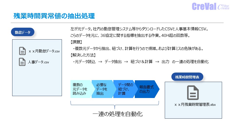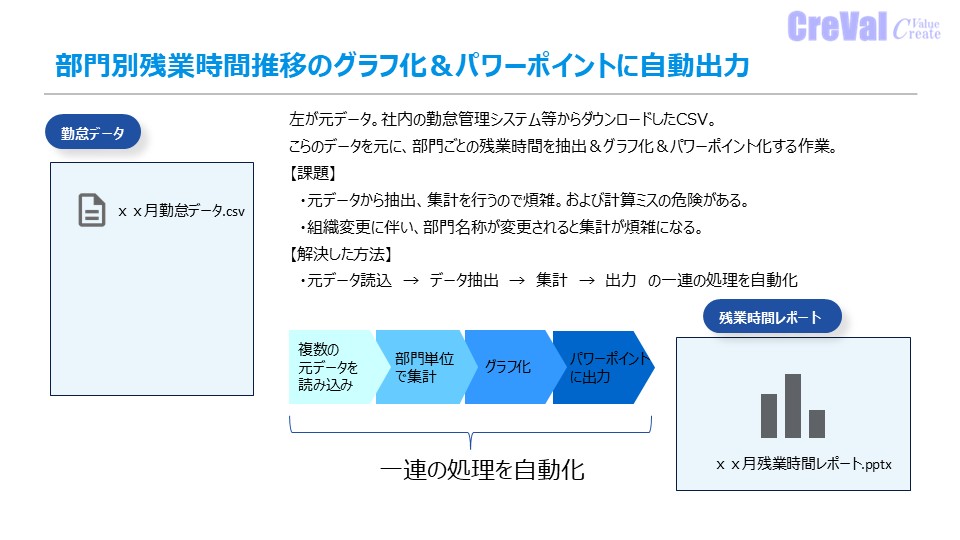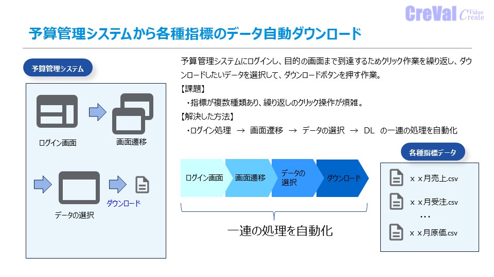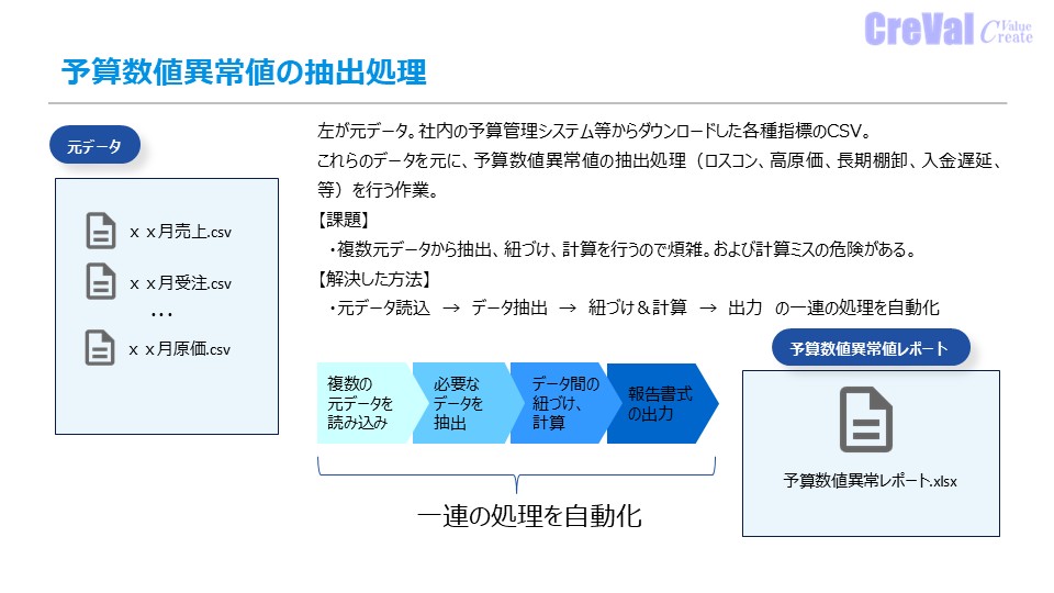 弊社には受注計上システム、原価管理システム、予算管理システム、購買発注システム等の様々のウェブ化されたシステムがありました。当部門ではこれらのデータを横断的に組み合わせて幹部向けの指標データを作る業務を行っており、データを横断的に処理するシステムの開発が積年の課題でした。しかしながら、幹部が交代する都度見たい観点が変化するため、大がかりなウェブシステムを開発するには無理がありました。