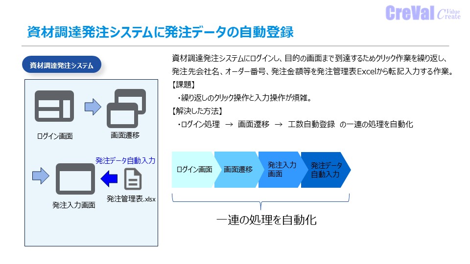 ヒアリング内容をもとに、お客様の従来作業手順に改善や効率化できる部分が無いかを検討致します。 むやみに自動化するのではなく、手順改善で済む場合もありますので、率直なご提案をさせて頂きます。 自動化する場合には、弊社の経験を活かし、これまでの面倒な作業手工程を簡単なクリック処理にするなどの、自動化プログラムをプロトタイプとして組み立てます。