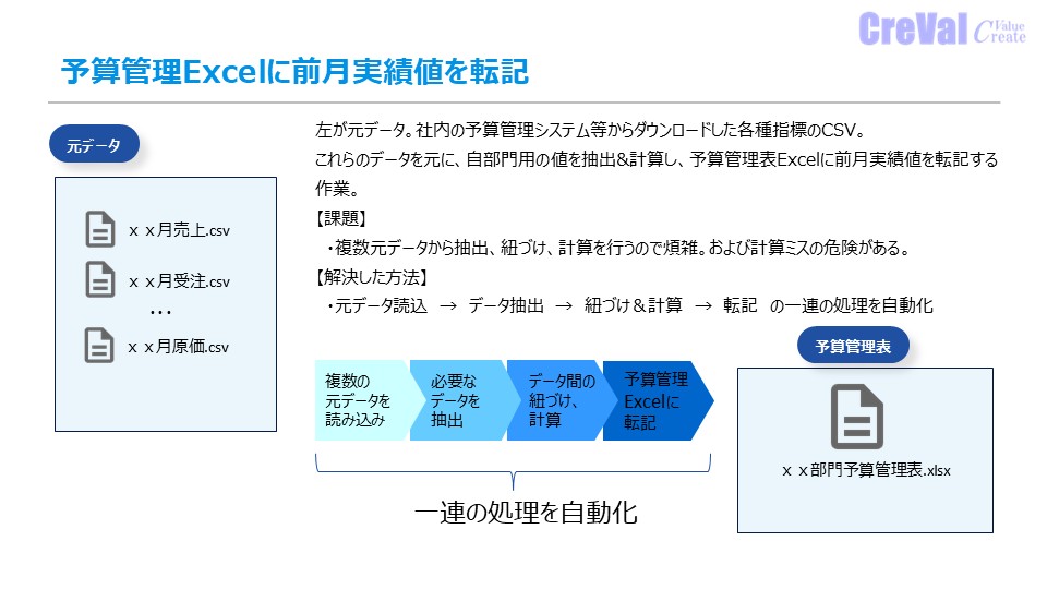 私の所属する事業部には複数の部が存在しており、これら各部の予算遂行上状況(各月の受注、売上、原価)を事業部全体として管理するために、各部を別々のシートに分けたExcelを用いて予算管理を行っております。課題は、前月実績値の転記作業でした。原価データ、売上データ、受注データ等をウェブシステムからエクスポートしたCSVから、オーダーごとの値を一つ一つ拾ってこのExcelの前月の列にコピペする作業が恐ろしく時間のかかる面倒な作業でした。この作業を各部に依頼すると各部の貴重な工数が費やされてしまうため、私の予算管理部門で転記してから各部に配布しています。月初の早い時点で前月実績値を転記したものを各部に配布する必要があり、転記の高速化・自動化が求められていました。
